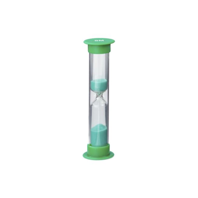 Fünf verschiedene Sanduhren mit unterschiedlichen Sandfarben und Zeiten: 30 Sekunden, 1, 3, 5 und 10 Minuten.