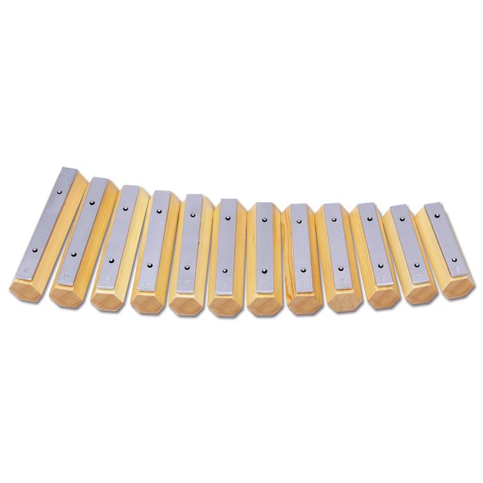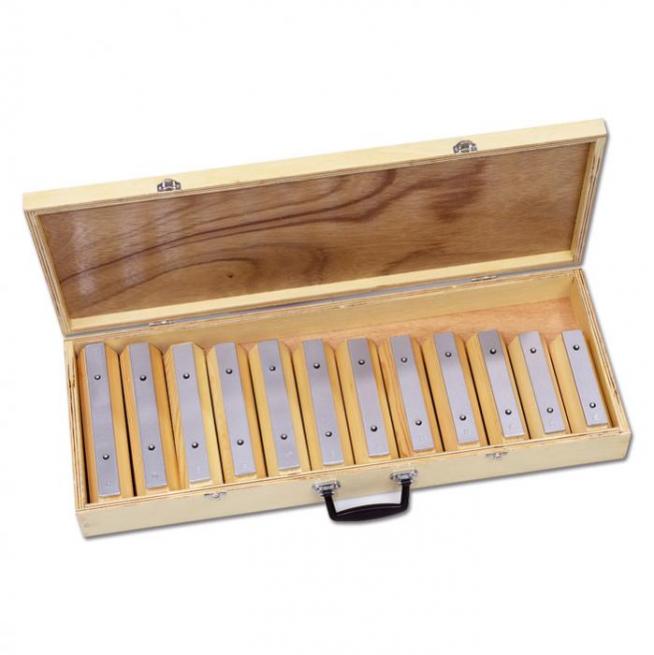 Der Tonumfang umfasst den Bereich c2 – e3 mit den Halbtönen b2 und fis2. Schlägel und Klangbausteine sind in einem Holzkoffer mit Klappdeckel untergebracht.