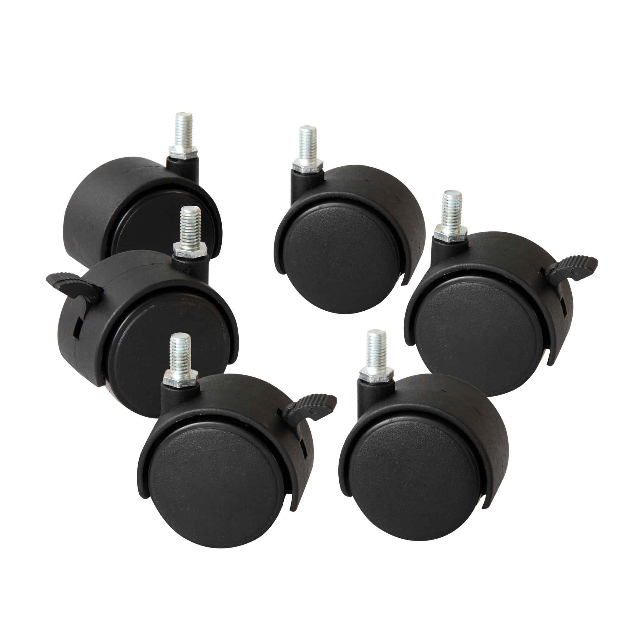 6 leicht laufende Rollen für Moderationstafeln. 4 Rollen sind feststellbar für einen festen Stand. Mit 8 mm Gewinde.