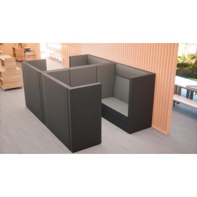 Schaffen Sie einen Raum im Raum – ohne Umbau. Die Schallschutz-LernLounge besteht aus zwei Hochlehner-Sofas, verbunden durch eine weich gepolsterte Verbindungswand. So entsteht eine Sitzkoje als geschützter Rückzugsort für Schülerinnen, Schüler und Lehrkräfte. Planen Sie hier eine Pause zum Durchatmen, eine konzentrierte Lernphase, Partnerarbeit oder ein ruhiges Coaching.