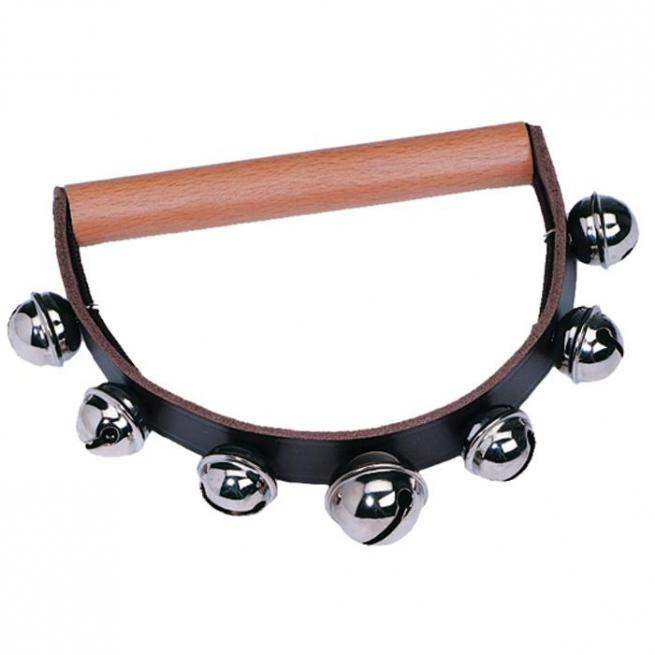 Lederband mit Holzgriff. Eine große und 6 kleine Schellen.