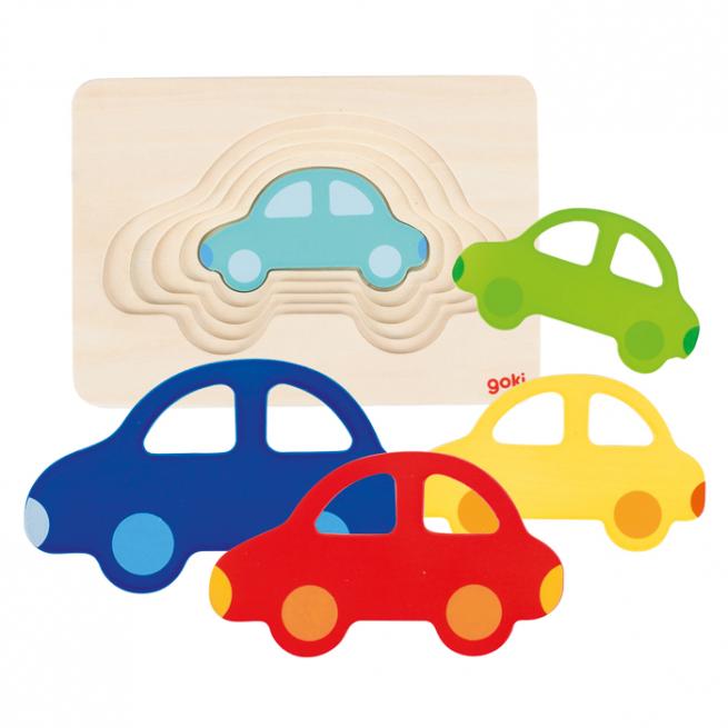 Hier wird vom kleinsten zum größten Auto sortiert. Insgesamt 5 farbenfrohe Autos gilt es in den Holzrahmen zu sortieren. Ab 2 Jahren.