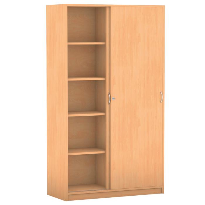 Wo offen stehende Türen im Weg sind, helfen Schiebetüren weiter. Korpus, Front, einzelne Böden und die Rückwand sind 19 mm stark. Besonders die schwere Rückwand beugt dem gefährlichen Kippeffekt vor. Die qualitativ hochwertige Melaminharzbeschichtung ist robust und trotzt den jahrelangen schulalltäglichen Belastungen. Abnutzungserscheinungen werden durch die 2 mm ABS-Kante verhindert, denn sie bietet Schutz vor Stößen und Feuchtigkeit. Verschmutzungen wischen Sie einfach feucht ab. Das Verriegelungssystem bestehend aus Griff und Zylindersicherheitsschloss macht den Schrank zudem besonders schultauglich. Sämtliche Utensilien sind sicher verstaut.