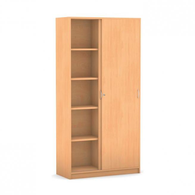 Wo offen stehende Türen im Weg sind, helfen Schiebetüren weiter. Korpus, Front, einzelne Böden und die Rückwand sind 19 mm stark. Besonders die schwere Rückwand beugt dem gefährlichen Kippeffekt vor. Die qualitativ hochwertige Melaminharzbeschichtung ist robust und trotzt den jahrelangen schulalltäglichen Belastungen. Abnutzungserscheinungen werden durch die 2 mm ABS-Kante verhindert, denn sie bietet Schutz vor Stößen und Feuchtigkeit. Verschmutzungen wischen Sie einfach feucht ab. Das Verriegelungssystem bestehend aus Griff und Zylindersicherheitsschloss macht den Schrank zudem besonders schultauglich. Sämtliche Utensilien sind sicher verstaut.