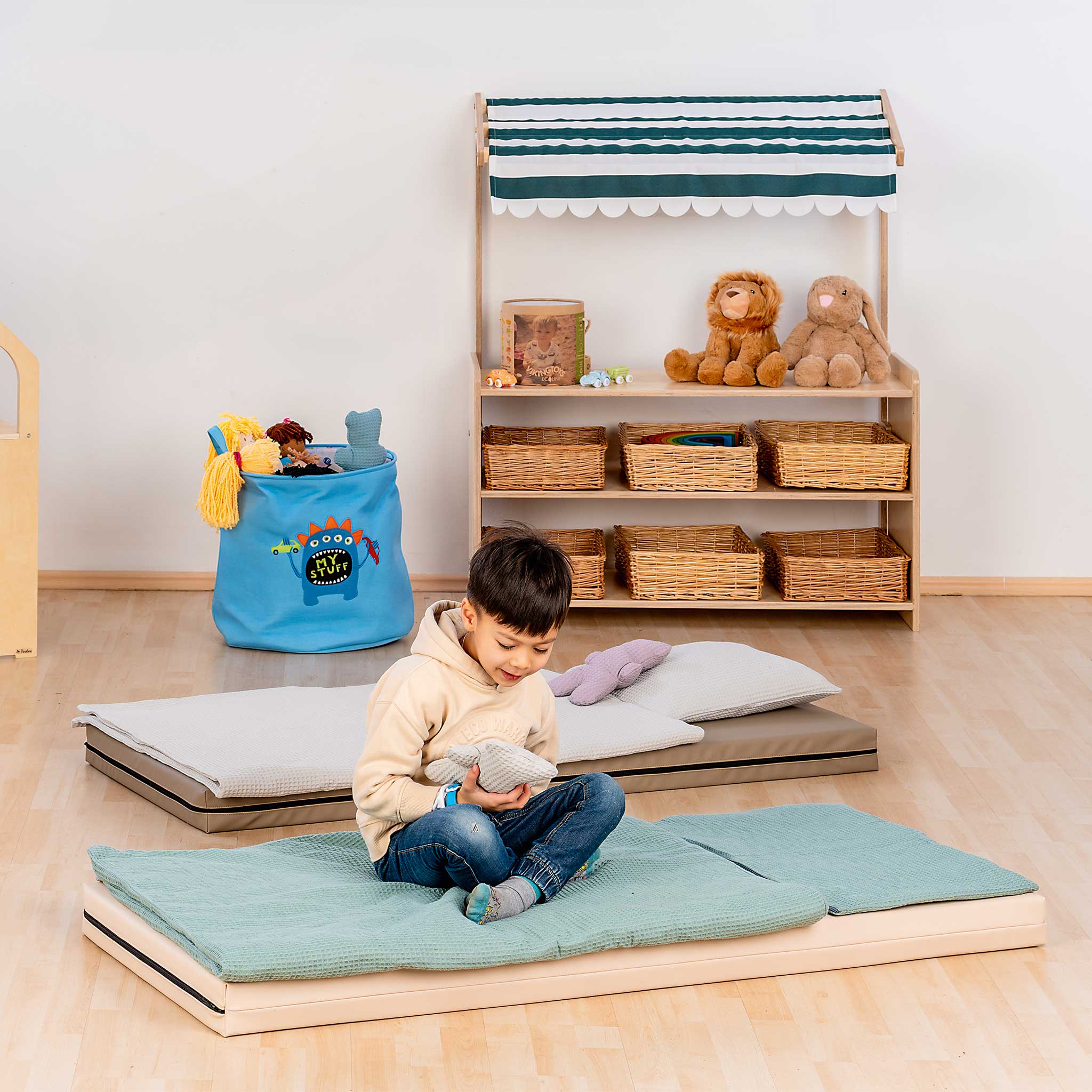 Bezogen sind die 8 cm starken und 60 cm breiten Matten in unterschiedlichen Längen entweder beidseitig mit Kunstleder Puna oder mit je einer Hälfte dunkelblauem Polyesterstoff bzw. Kunstleder Puna (Art.-Nr. 51097). Dieses hochwertige und moderne Kunstleder besteht aus 100 % lösungsmittelfreiem Polyurethan (PU) auf Wasserbasis und ist PVC-frei. Es ist OEKO-TEX® 100 Klasse 1 konform, biokompatibel sowie REACH-konform und schwer entflammbar nach EN 1021 1 + 2. Im Brandfall entsteht keine Toxizität des Rauches mit Dioxin. Im Vergleich zu herkömmlichem PVC-Kunstleder ist Puna besonders atmungsaktiv. Zudem verändert die thermoflexible Beschichtung den Härtegrad nicht und bietet auch bei kalten Temperaturen hohen Sitzkomfort. Die Kombination aus der hohen Dichte des festen Schaumstoffs der Matten und dem Kunstlederbezug Puna erzielt ein ideales Rückstellverhalten, was die Faltenbildung verhindert. Zum Schlafen, Toben und Turnen in Ihrer Einrichtung sind die Matten die optimale Unterlage. Die Bezüge sind abnehm- und waschbar im Feinwaschgang bei 30 °C.