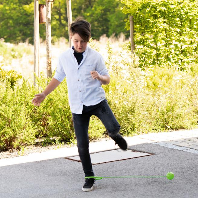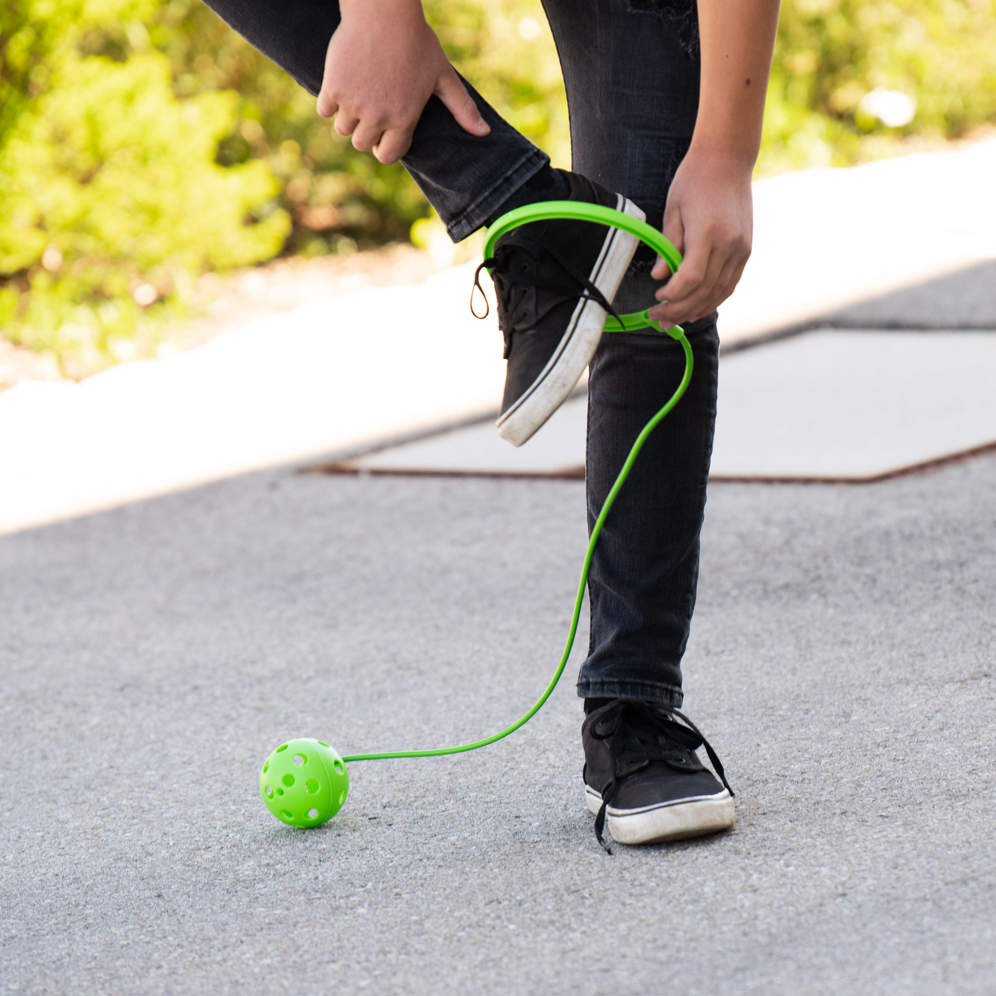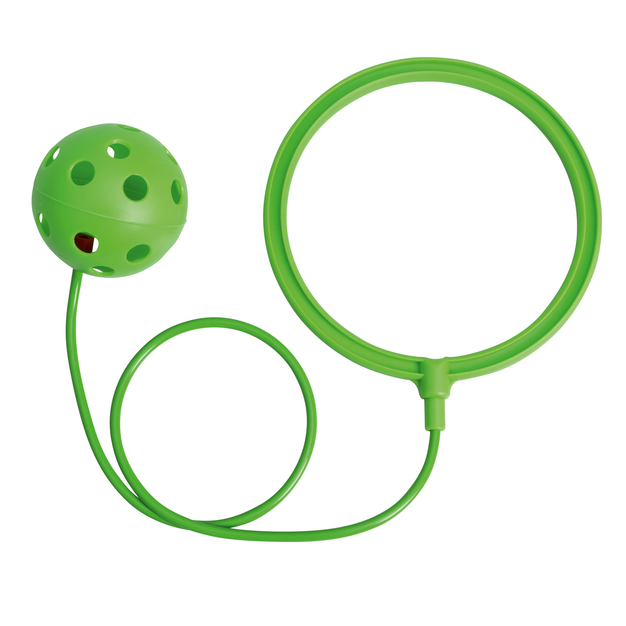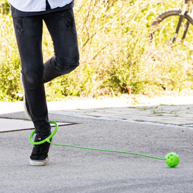 Der Schleuderball ist ein tolles Pausenspielzeug und kann alleine gespielt werden. Einfach mit einem Fuß in den Kunststoffring steigen und den Ball mit kreisend in Bewegung bringen. Während die Kinder den Ball um ihre Fußknöchel "schleudern" und über die Schnur hüpfen, können sie sich auspowern und gleichzeitig ihre Koordination und Motorik trainieren.