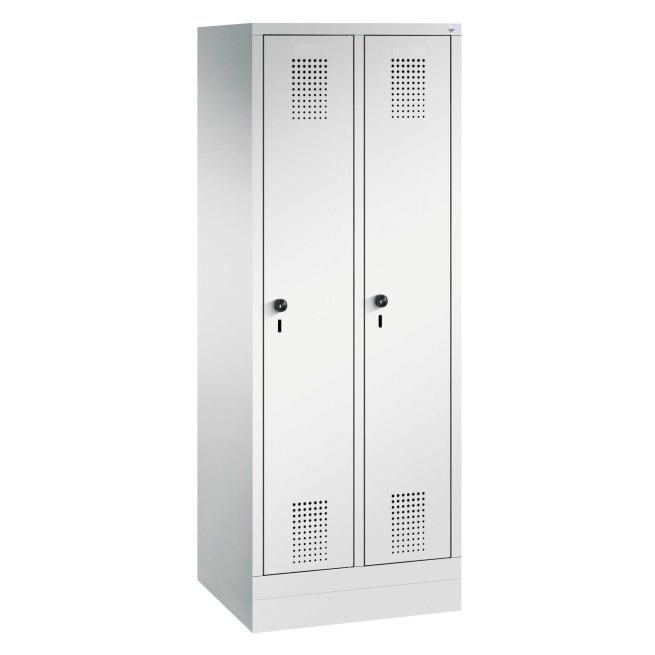 Korpus und Türen bestehen aus Stahl. Jedes Schließfach ist innen mit einer Kleiderstange mit 3 Schiebehaken ausgestattet. Die Türen sind rechts angeschlagen und einzeln schließbar. Im Sicherheits-Drehriegel lässt sich ein Vorhängeschloss (nicht mitgeliefert) einsetzen. Der Vorteil dieses Schließsystems ist: Wenn mal ein Schlüssel verloren geht, wird einfach das Vorhängeschloss entfernt, dabei bleibt das Türschloss immer intakt. Für die optimale Belüftung des Innenraums sorgen Lüftungslöcher in den Türen, in den Fachböden und im Sockel.