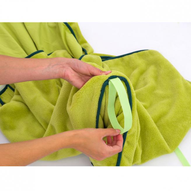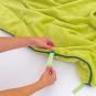 Der gemütliche, hellgrüne Schmuse-Schlafsack ist waschbar bei 30 °C.