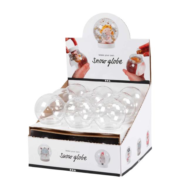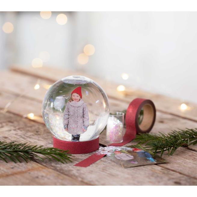 Super, um tolle Weihnachtsgeschenke selbst zu gestalten. Einfach Figuren und Dekomaterial auf die Innenseite des Deckels kleben, Glitzer oder Kunstschnee hinzufügen und mit destilliertem Wasser bis etwa 0,5 cm unter den Kugelrand befüllen. Ab 4 Jahren.