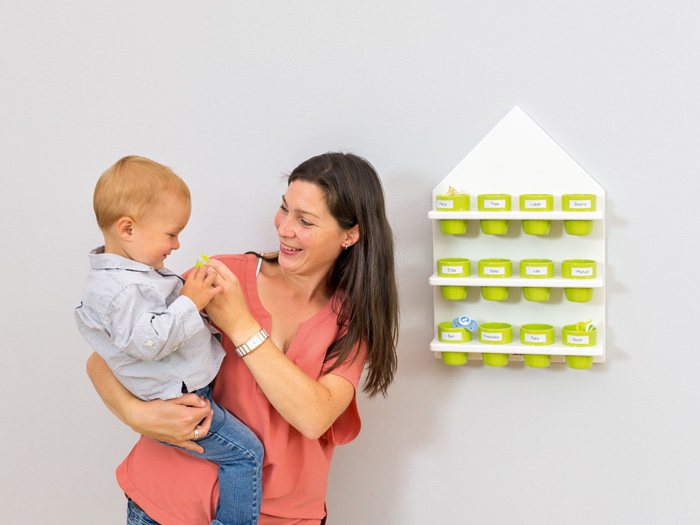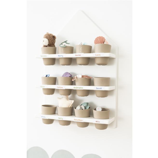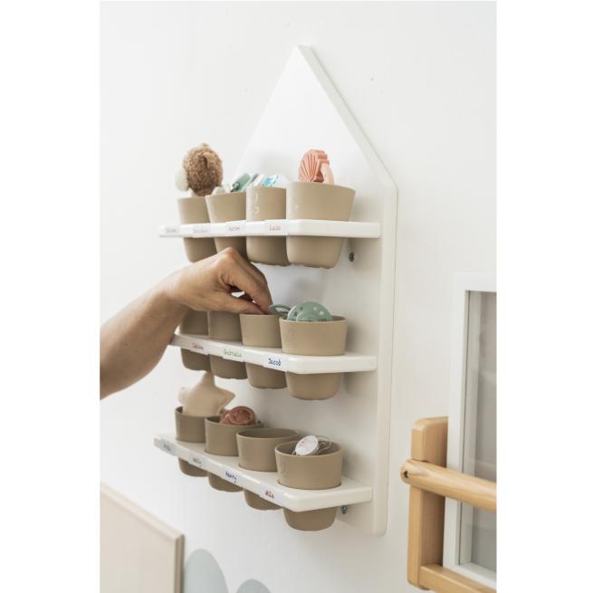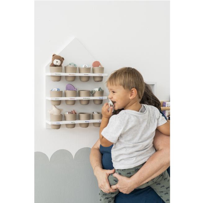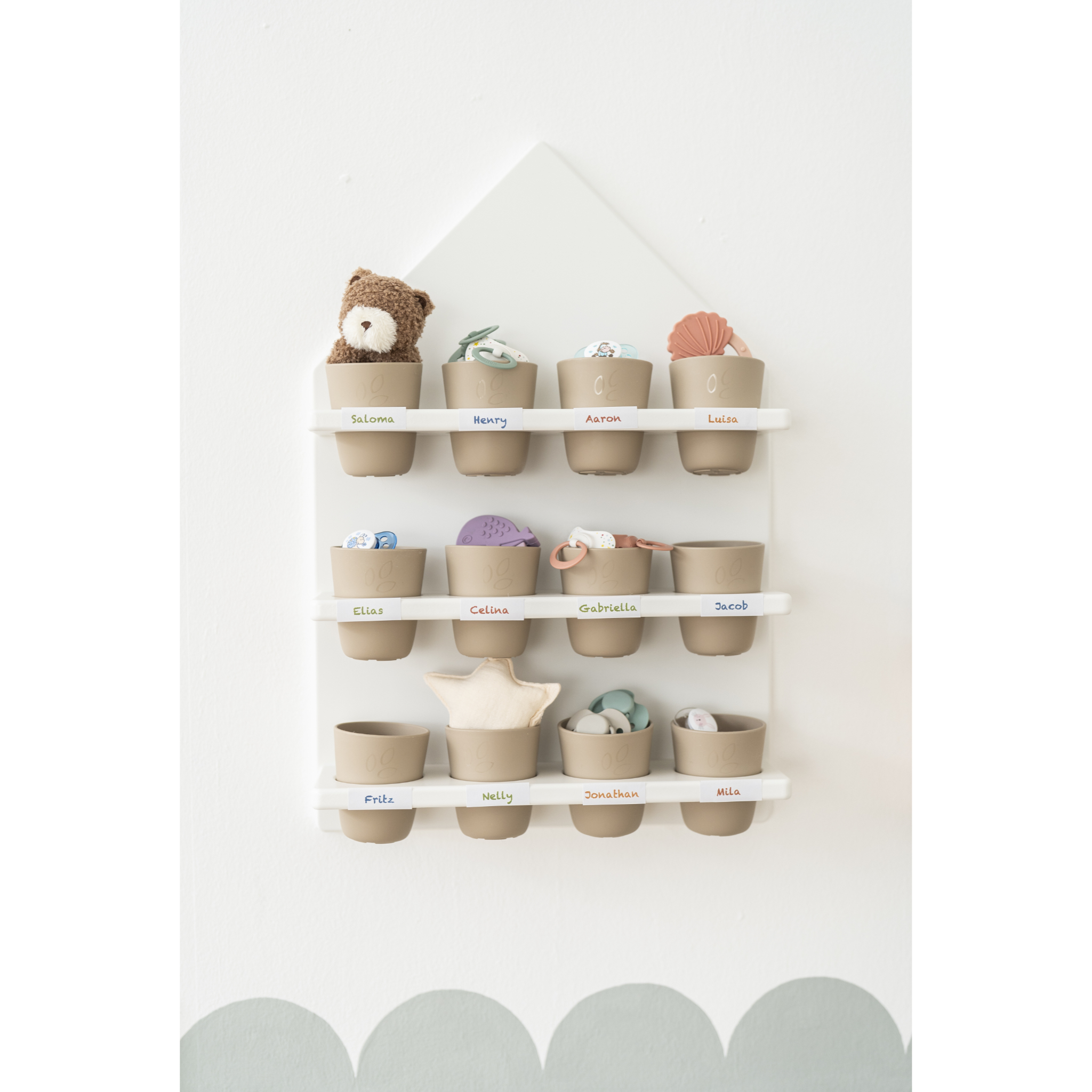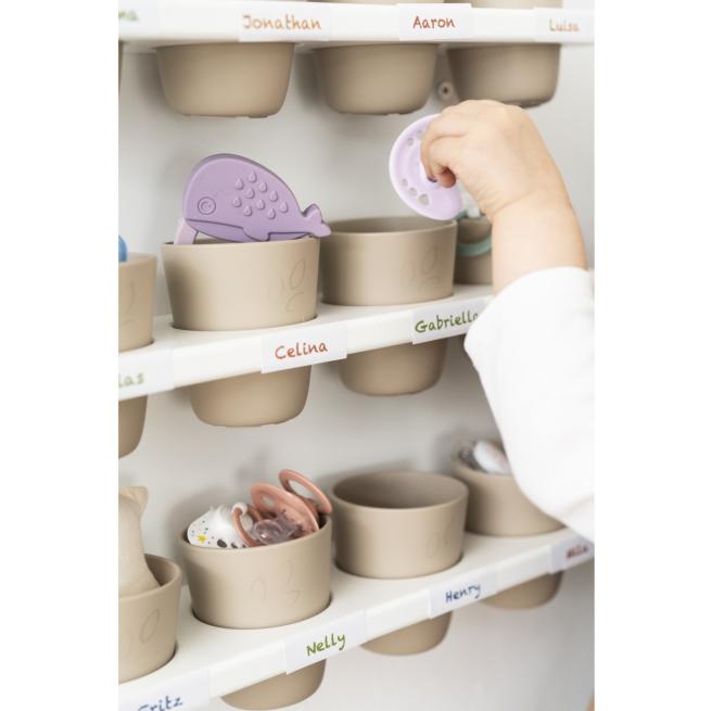 Hier bewahren Sie die Schnullis Ihrer Kleinen einzeln und hygienisch auf. In den grauen Bechern aus treeNside-Material finden 12 Schnuller Platz. Damit es keine Verwechslungen gibt, kennzeichnen Sie die einzelnen Becher bzw. die Regalböden mit Namensschildern (bitte separat bestellen). Herausnehmbar und spülmaschinengeeignet. Zur Selbstmontage.