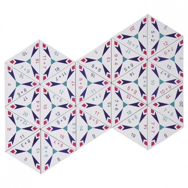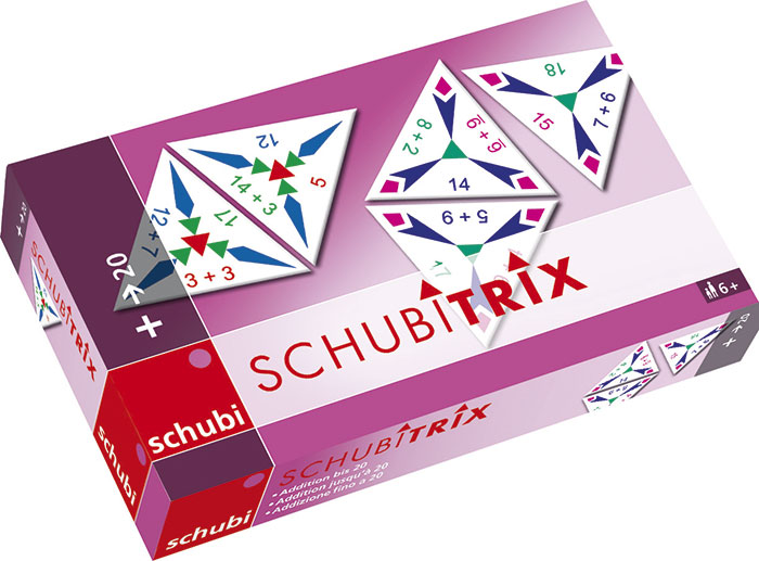 SchubiTRIX wird nach den bekannten Dominoregeln gespielt. Jeweils 24 bunt gestaltete, dreieckige Spielkarten aus stabilem Karton werden so aneinander gelegt, dass Rechnungen und Ergebnisse an den Seiten zusammenpassen. Am Schluss ist eine Figur entstanden, die eine rasche Selbstkontrolle ermöglicht. Ab dem 1. Schuljahr
