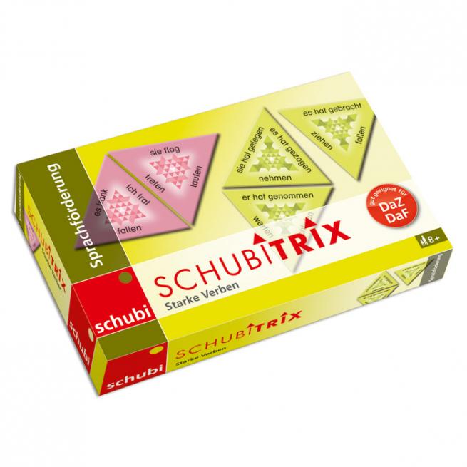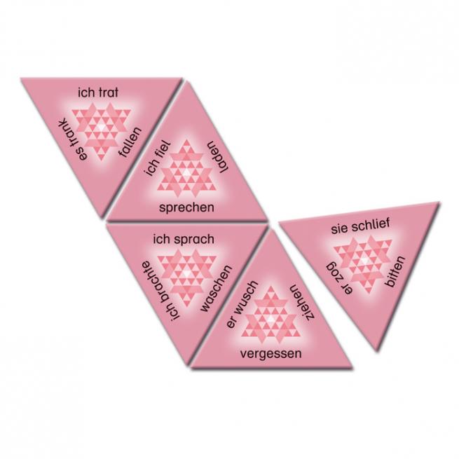 Auf jeder Spielkarte dieses Legespiels sind drei starke Verben vertreten, entweder im Infinitiv oder flektiert mit einem Personalpronomen. Die Kinder legen jeweils die Grundform des Verbs und seine Personalform zusammen.