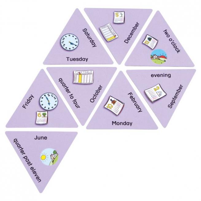 Hier wird nicht nur spielerisch der englische Wortschatz trainiert, sondern gleichzeitig das englische Schriftbild eingeprägt. Gespielt wird nach Dominoregeln. Jeweils 18 farbige, dreieckige Spielkarten aus stabilem Karton werden so aneinandergelegt, dass ein Bild und das passende englische Wort an den Seiten zusammenpassen. Am Ende entsteht eine Figur, die eine rasche Selbstkontrolle ermöglicht.