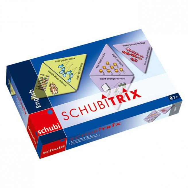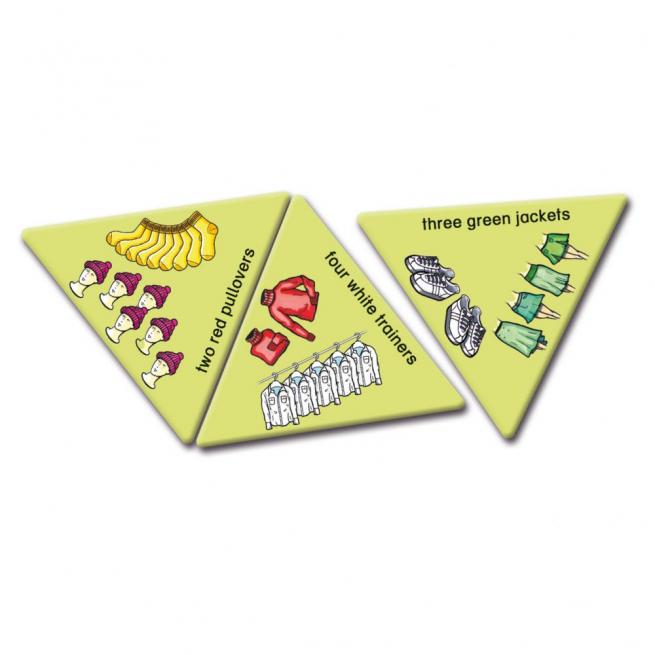 Hier wird nicht nur spielerisch der englische Wortschatz trainiert, sondern gleichzeitig das englische Schriftbild eingeprägt. Gespielt wird nach Dominoregeln. Jeweils 18 farbige, dreieckige Spielkarten aus stabilem Karton werden so aneinandergelegt, dass ein Bild und das passende englische Wort an den Seiten zusammenpassen. Am Ende entsteht eine Figur, die eine rasche Selbstkontrolle ermöglicht.