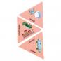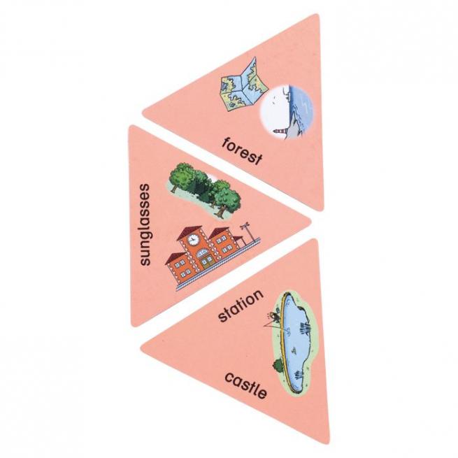 Hier wird nicht nur spielerisch der englische Wortschatz trainiert, sondern gleichzeitig das englische Schriftbild eingeprägt. Gespielt wird nach Dominoregeln. Jeweils 18 farbige, dreieckige Spielkarten aus stabilem Karton werden so aneinandergelegt, dass ein Bild und das passende englische Wort an den Seiten zusammenpassen. Am Ende entsteht eine Figur, die eine rasche Selbstkontrolle ermöglicht.