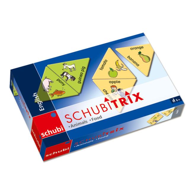 Hier wird nicht nur spielerisch der englische Wortschatz trainiert, sondern gleichzeitig das englische Schriftbild eingeprägt. Gespielt wird nach Dominoregeln. Jeweils 18 farbige, dreieckige Spielkarten aus stabilem Karton werden so aneinandergelegt, dass ein Bild und das passende englische Wort an den Seiten zusammenpassen. Am Ende entsteht eine Figur, die eine rasche Selbstkontrolle ermöglicht.