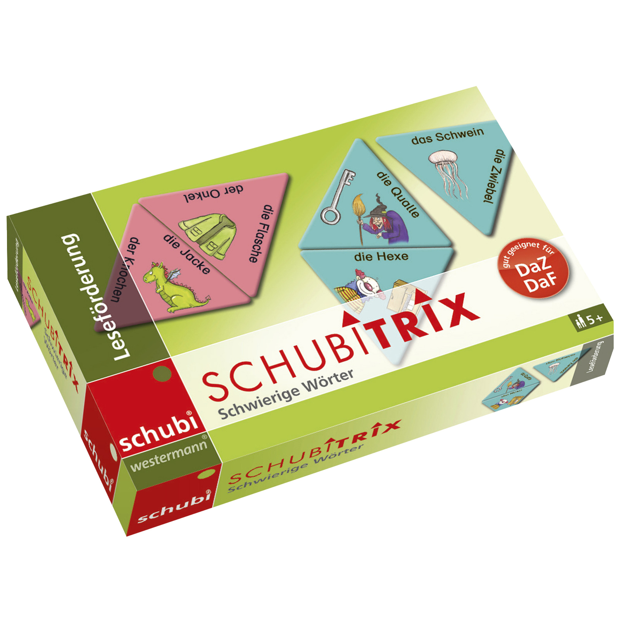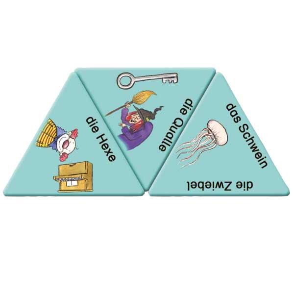 Gespielt wird nach Dominoregeln. Jeweils 18 farbige, dreieckige Spielkarten aus stabilem Karton werden so aneinander gelegt, dass z.B. Bild und Text an den Seiten zusammenpassen. Am Ende entsteht eine Figur, die eine rasche Selbstkontrolle ermöglicht.