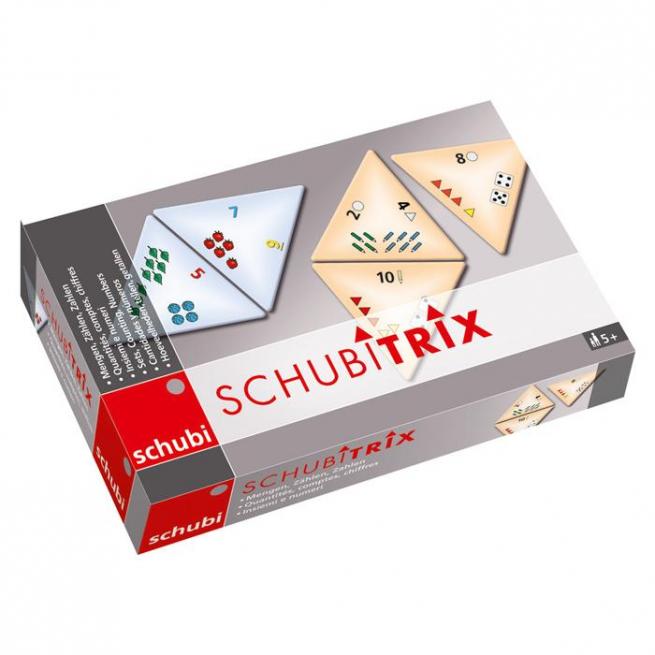 Jede der dreieckigen Karten aus stabilem Karton enthält eine Aufgabe, die Lösung steht auf einer anderen Karte. Die Spielkarten werden wie beim beliebten Domino passend aneinandergelegt – bei SchubiTRIX grenzen immer Aufgabe und Lösung aneinander. Wenn die Karte richtig liegt, stimmen gleich 3 Ergebnisse. Zum Schluss entsteht ein geschlossenes Muster. Das Spiel schult Konzentration und Kopfrechen. Ideal auch für den Förderunterricht.