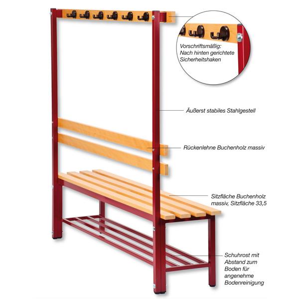 Die Schülergarderoben mit Sitzbank sind hier eine robuste und ansprechende Lösung. Der Platz an den Wänden wird optimal genutzt. Durch den Abstand des Schuhrosts zum Boden kann einfach gewischt werden, ohne dass die Garderobe verschoben oder angehoben werden muss. Gestell aus äußerst stabilem Stahlrohr, Sitzfläche und Rückenlehne aus massivem Buchenholz, 20 mm stark. Lieferung erfolgt fertig aufgebaut.