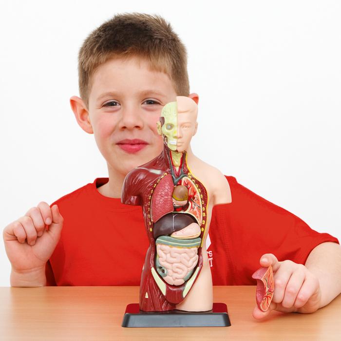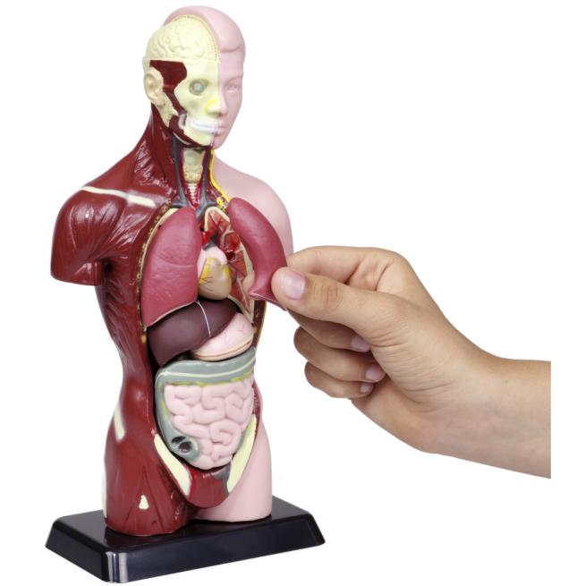 Kinder interessiert es, wie ein Mensch von innen aussieht, wie alles funktioniert und wo alles hingehört. Folgende Organe sind herausnehmbar: Lunge, Herz, Magen, Leber und Darm. So können auch die dahinter liegenden Organe betrachtet werden. Auch Muskulatur und Gehirn sind gut sichtbar. Der Torso besteht aus hochwertigem Kunststoff.