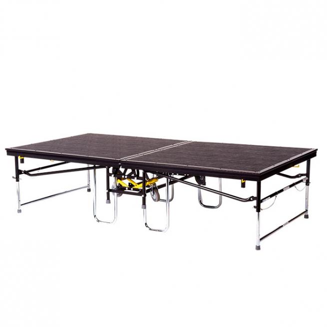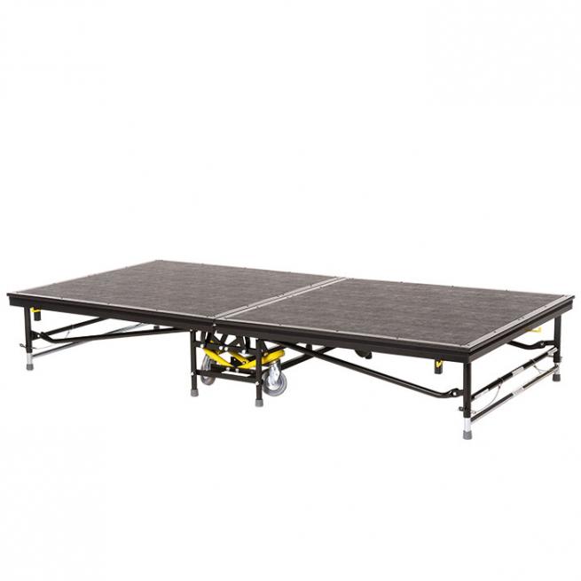 Der Aufbau gelingt im Handumdrehen ganz ohne Werkzeug durch nur eine Person. Die extrem robuste Oberfläche ist schwer entflammbar, rutschfest und trittschallgedämmt. Acht lasttragende Beine stabilisieren und geben festen Stand. Die Traglast der Bühnen beträgt 750 kg/m². Für Strapazierfähigkeit sorgt die vinylbeschichtete Stahlkante. An der Klettbandeinfassung bringen Sie einfach den schwer entflammbaren Vorhang an. Bei Nichtgebrauch klappen Sie die Bühnen-Elemente einfach zusammen und lagern Sie platzsparend. Durch hochbelastbare, bodenschonende Räder sind die Elemente flexibel.