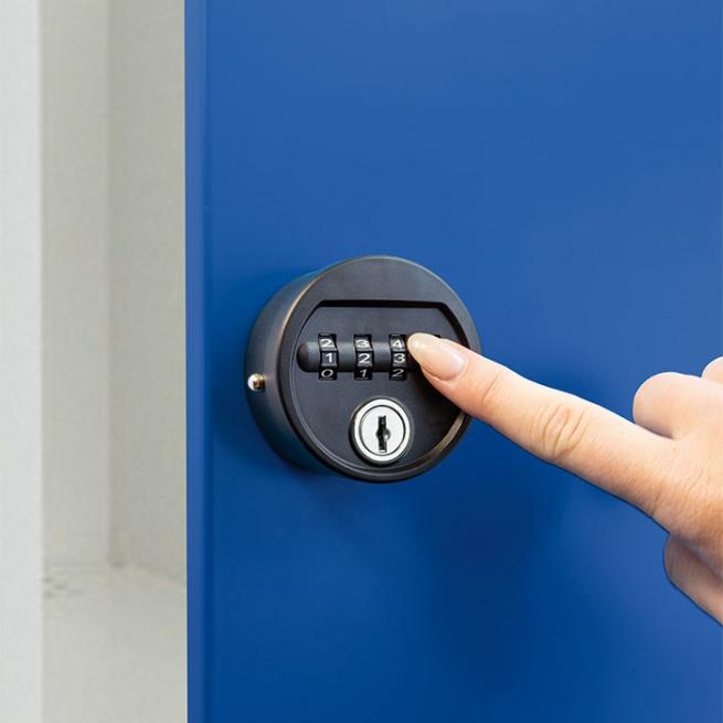 | Diebstahl-Schutz in 4 Schloss-Varianten: 1) Standard 2) Sicherheits-Drehriegel mit Vorhangschloss 3) Elektronisches Pin-Code-Schloss 4) Mechanisches Zahlenschloss • für feste Nutzer • für wechselnde Nutzer Service-Schlüssel für das elektronische Pin-Code-Schloss Service-Schlüssel für das mechanische Zahlenschloss |