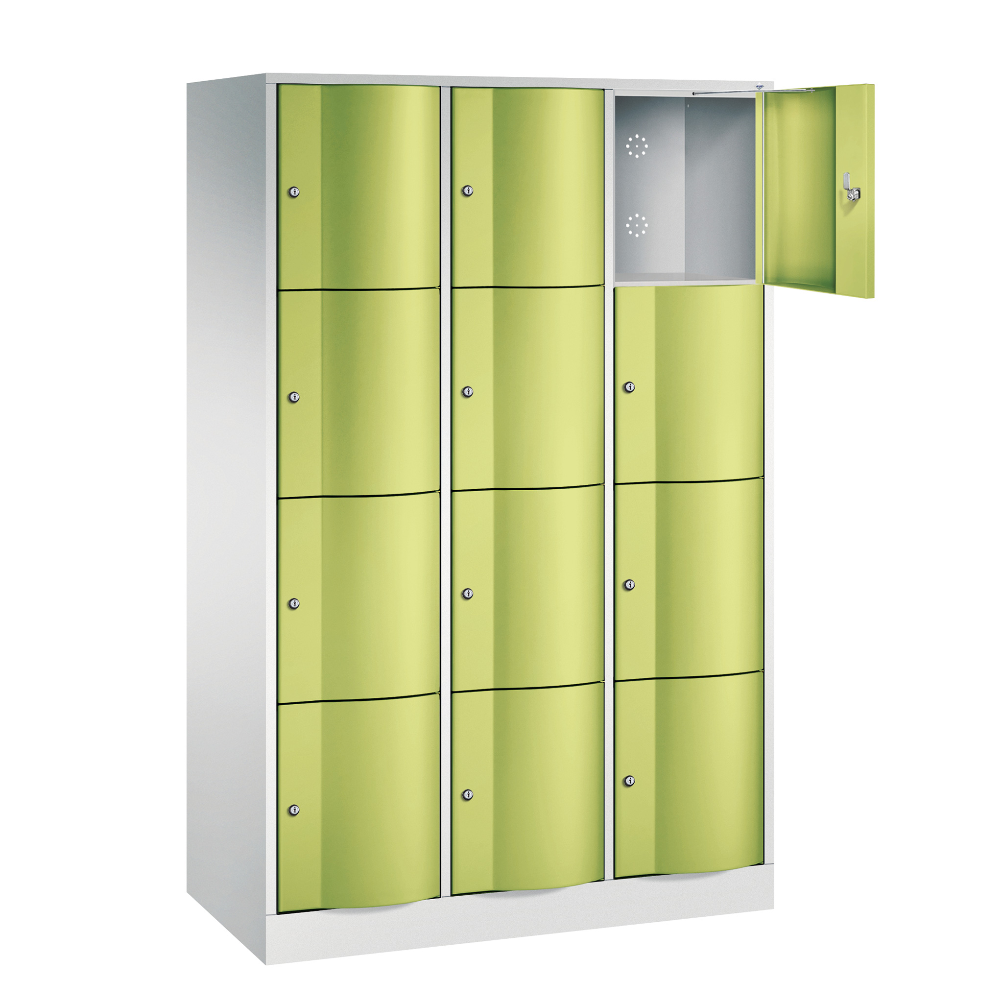 Schließfachschränke mit robusten Spezialtüren. 3 Reihen, 4 Fächer übereinander. Pro Tür ein Zylinderschloss mit 2 Schlüsseln.