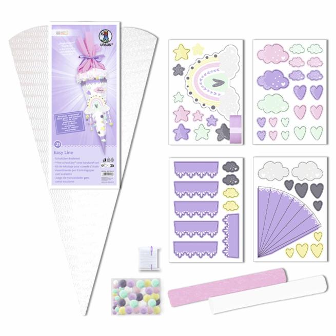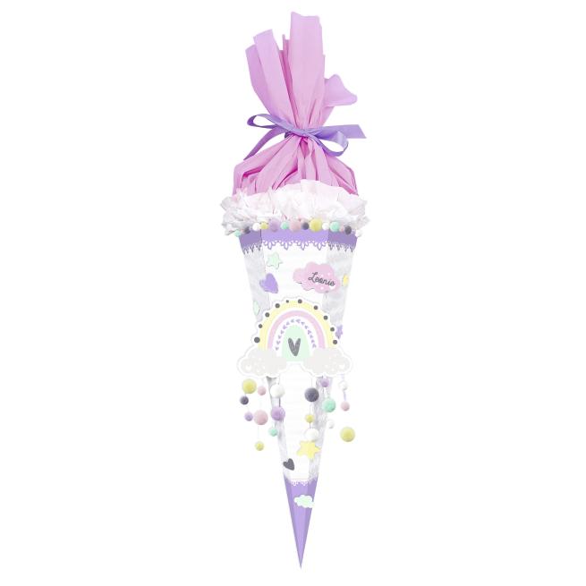 Diese himmlische Schultüte in zarten bunten Farben und mit herrlichem Regenbogen basteln Sie in Windeseile. Den 6-eckigen Tütenrohling aus weißer Bastelwellpappe gestalten Sie mithilfe der vorgestanzten und teilweise beglitterten Teile sowie der bunten Pompons – auch als Deko am Tütenrand eine kleine Augenweide. Den hübschen Regenbogen – ergänzt um Satinbändchen und daran befestigte Pompons – platzieren Sie als besonderen Blickfang in der Mitte. Die beiden Rollen weißes und rosafarbenes Bastelkrepp (jeweils 250 x 50 cm) verwenden Sie als Krempe und Verschluss der Tüte. Sie befestigen beides am inneren Rand des Rohlings. Als krönenden Abschluss binden Sie die Tüte mit einer Schleife aus dem Satinband zu. Perfekt! Was mag wohl in der Tüte versteckt sein? Mit der fertigen Schultüte Regenbogen halten Ihre Kinder zum Schulstart einen bezaubernden Begleiter in den Händen!