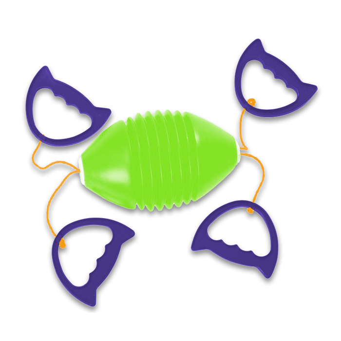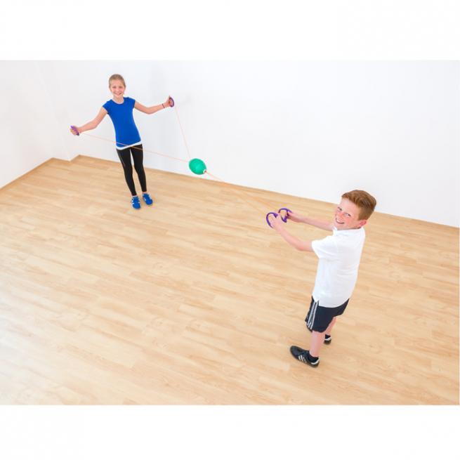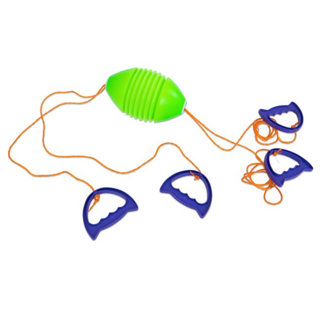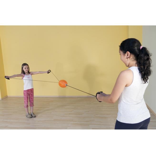 Das eine Kind zieht die beiden Seilenden auseinander, um dem Ei aus Kunststoff Schwung zu geben. Das andere Kind hält die Seilenden zusammen. Trainiert Reaktion, Koordination und speziell Arme und Schulterbereich.