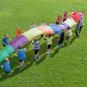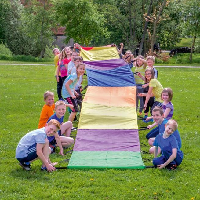 Sie können das lange Schwungtuch unterschiedlich nutzen, z. B. für rhythmische Übungen wie anheben und wieder absenken. Oder leichte Bälle werfen, wieder auffangen und auf der langen Schlange entlangrollen. Bei all diesen Spielen kommt es vor allem auf das Zusammenwirken aller an. Darum fördert der Einsatz des Schwungtuches den Teamgeist und die Koordination.