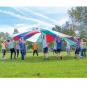 Fallschirmstoff mit Handgriffen am Rand und einem Loch mit Schnurverschluss in der Mitte. Die Schwungtücher sind mit einer 10 mm starken Leine im Schirmrand ausgestattet. So können mehrere Kinder mit dem Schwungtuch spielen, da sie auch ohne Handgriff einen festen Halt finden. Mit 18 Schlaufen und 16 Farbfeldern.