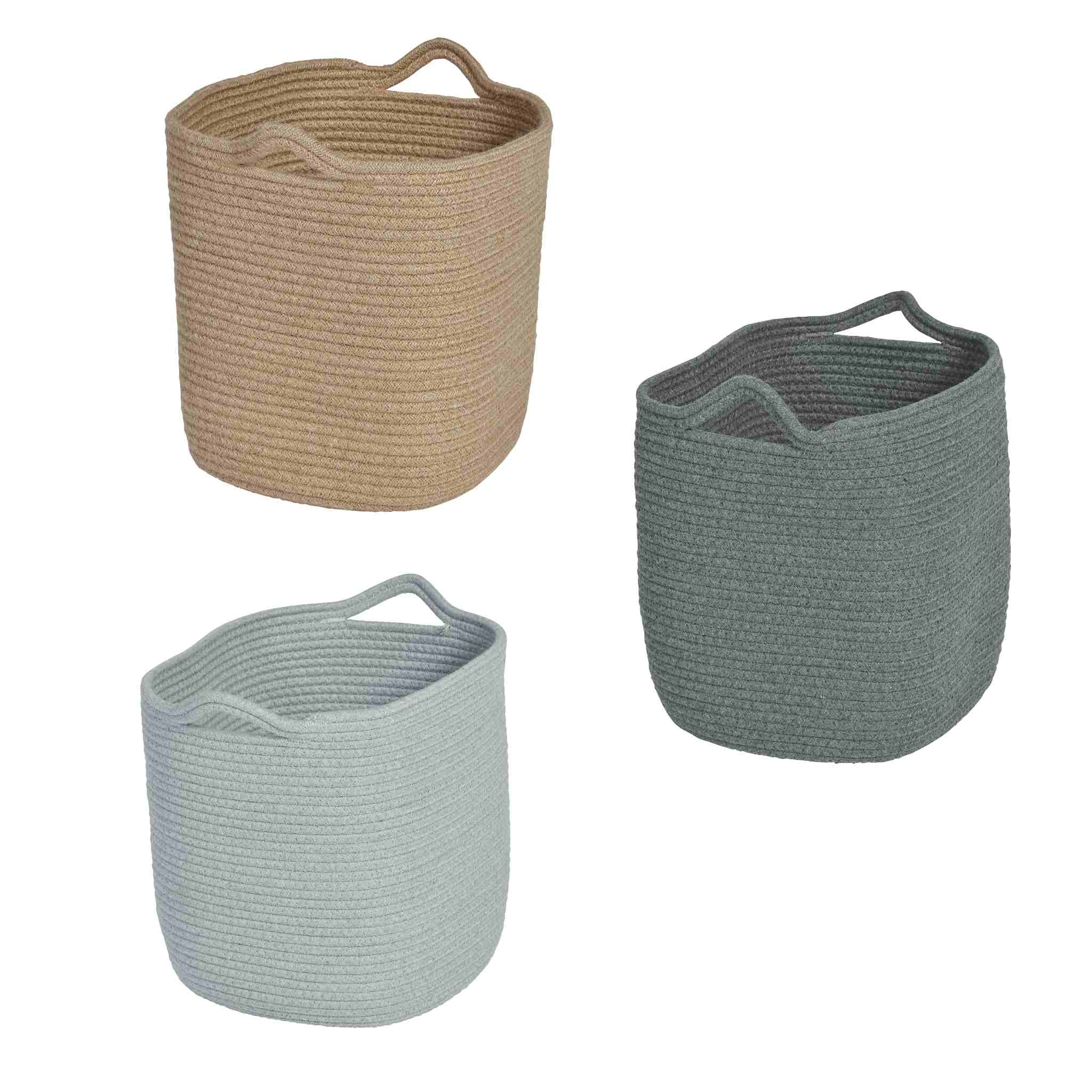 Weiche und flexible Konstruktion aus robustem Seil. Mit praktischen Tragegriffen. Die Körbe in Naturoptik bestehen aus 100 % Jute, Körbe in Hell- und Dunkelgrau aus 100 % Baumwolle, Handwäsche.