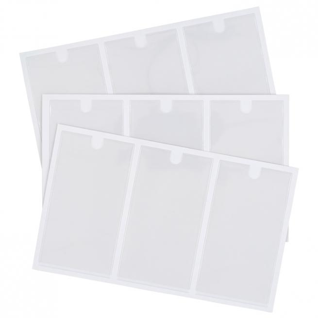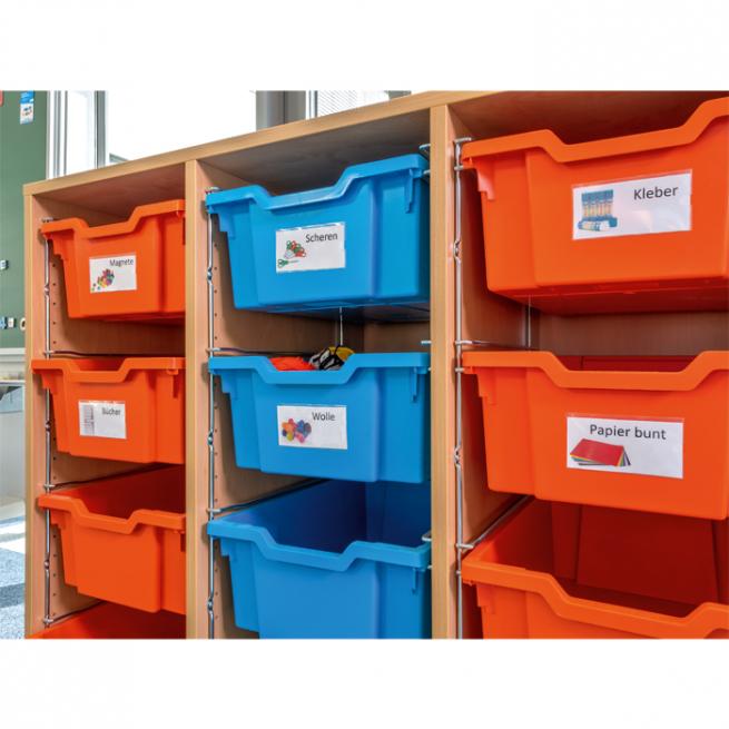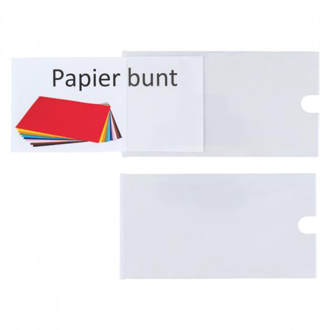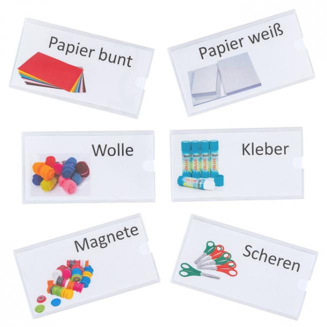 Wessen Box ist das oder was befindet sich darin? Einfach die Selbstklebetaschen aus transparentem Kunststoff anbringen, die jeweils beiliegenden Einsteckschilder beschriften und / oder bebildern und schon sind die Fragen geklärt.