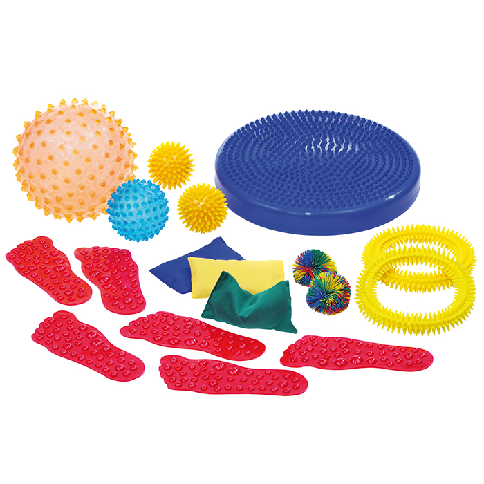 6 taktile Füße • 2 Noppenringe • 1 Balancier-Kissen • 3 Bohnensäckchen (Hülle: 100 % Baumwolle. Nur mit feuchtem Tuch reinigen) • 2 Wuselbälle, je 5 cm • 2 Noppenbälle, je 8 cm • 2 Sensobälle 11 cm und 23 cm • Aufbewahrungstasche (100 % Baumwolle, waschbar bei 30 °C)