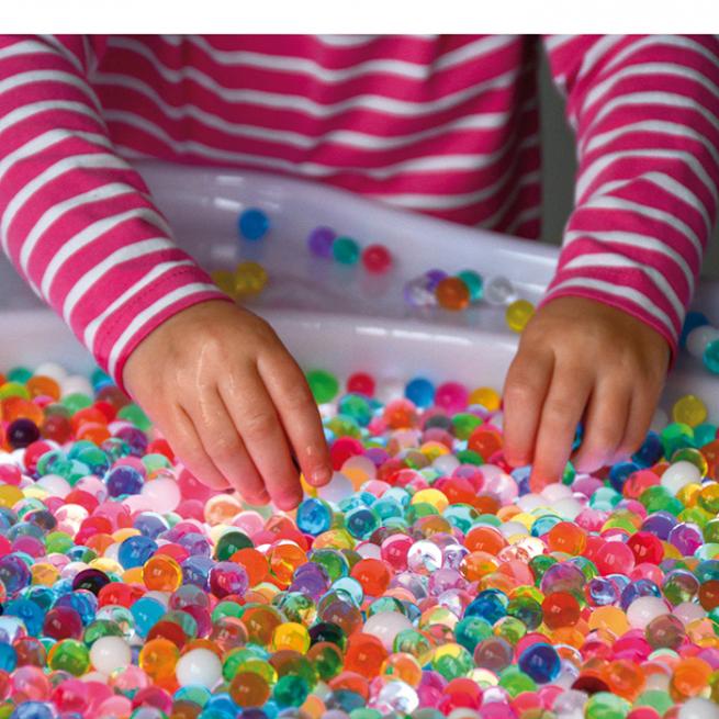 Ob bunt oder transparent – die Sensorikkügelchen sind ein Fest für die Haptik. Innerhalb kürzester Zeit saugen sich die kleinen Gelperlen im Wasser voll und vervielfachen so ihr Volumen. Optimal für Sinneserfahrungen, auch auf dem Leuchtkübel. Nicht zum Verzehr geeignet. Ab 3 Jahren.