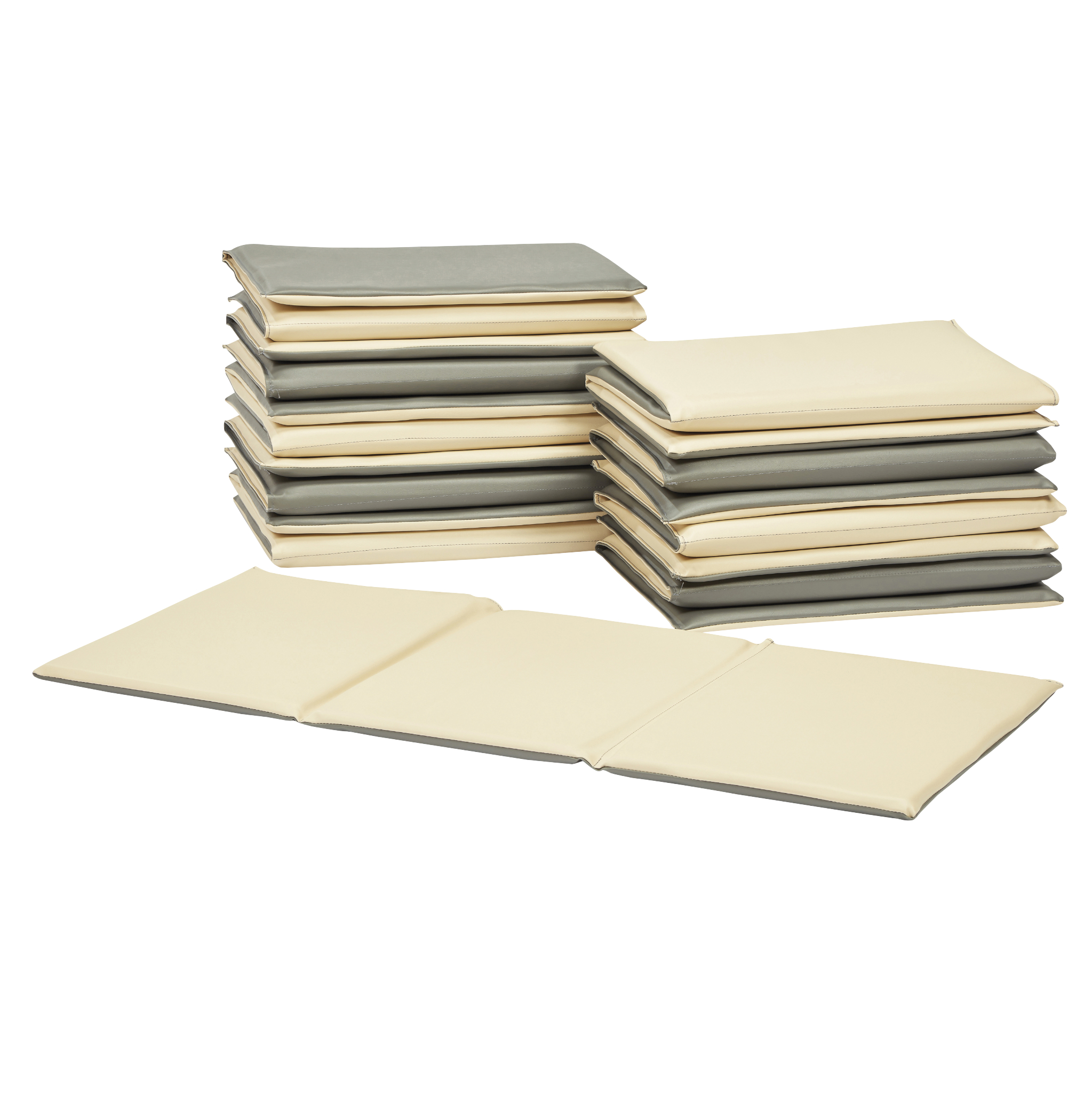 Das Set mit 10 Matten verstauen Sie leicht, denn die Matten sind faltbar. Im Nu entstehen Sitz- oder auch Schlafplätze für die Mittagsruhe. Die Matten nutzen Sie und die Kinder beidseitig. Die Vorderseite ist cremefarben, die Rückseite grau. Für stützenden Liege- oder Sitzkomfort sorgt der stabile Schaumstoffkern. Zudem sind die Matten besonders langlebig und pflegeleicht. Einfach mit einem feuchten Tuch abwischen. Geeignet für Kinder ab 18 Monaten.