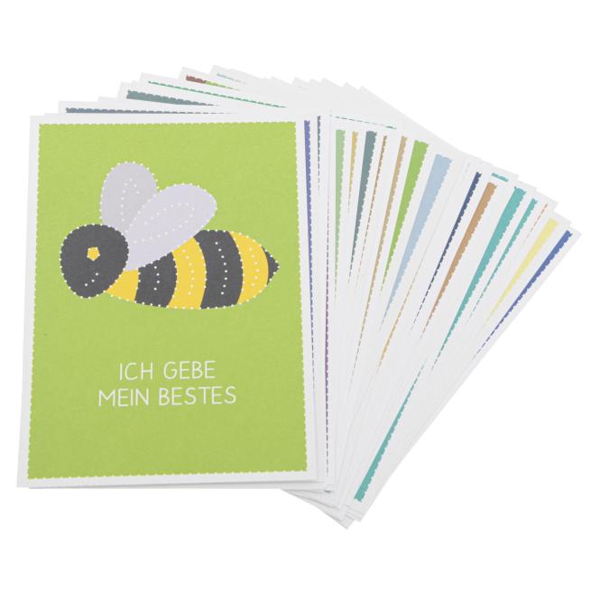 Das Prickel-Set mit 24+1 Affirmationskarten verbindet Bastelarbeit mit stärkenden Botschaften. Die DIN-A6-Karten aus umweltschonendem Recyclingpapier tragen positive Affirmationen wie „Ich bin mutig“, „Ich bin stark“ oder „Ich bin neugierig“. Über den Sprüchen befinden sich aufgedruckte Motive, die die Kinder mit einer Prickelnadel (nicht enthalten) nacharbeiten. So entsteht eine kreative Beschäftigung, die Bastelspaß, Konzentration und Feinmotorik direkt aufgreift. Das Set passt gut für Kindergarten, Schule und kleine Rituale im Alltag.