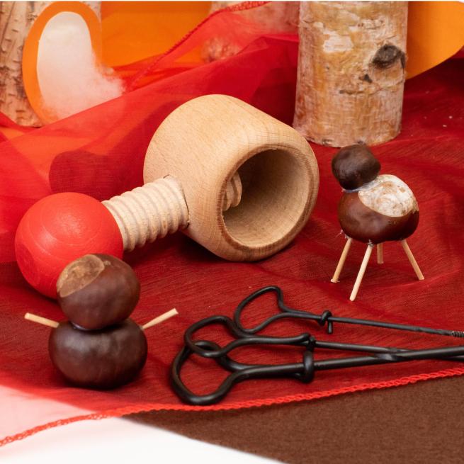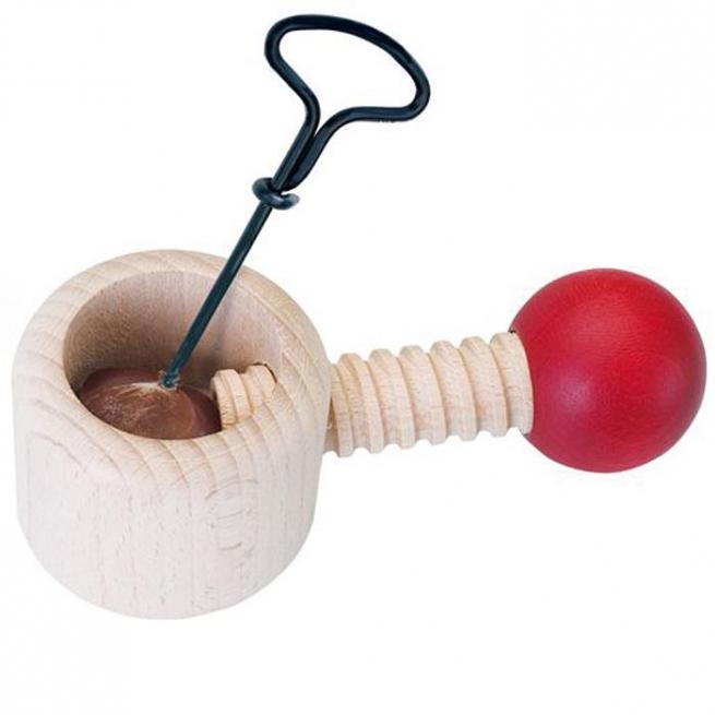 Die Zwinge aus Holz sorgt für sicheren Halt beim Durchbohren von Kastanien und Ähnlichem.