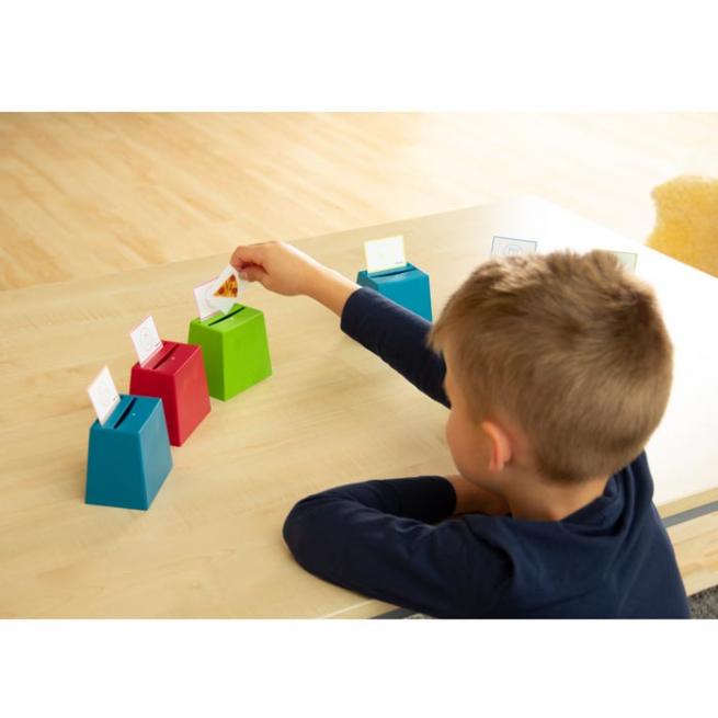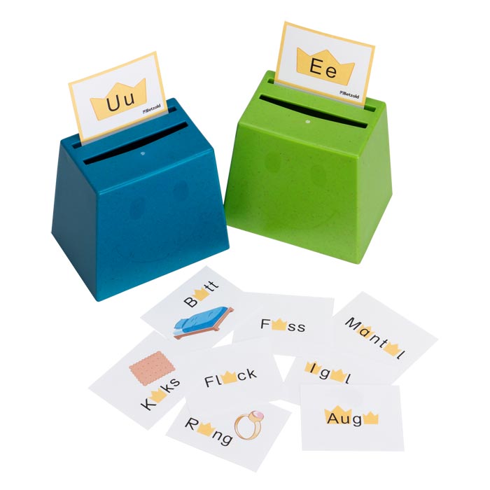 Mithilfe des Sortierspiels für die Becherquizzer (nicht enthalten) verstehen Kinder anschaulich, was Vokale sind. Auf den 5 Aufgabenkarten sind jeweils die Vokale a, e, i, o, u abgebildet, auf den 115 Sortierkarten stehen Wörter mit fehlendem Vokal. Die Kinder stecken die Aufgabenkarten jeweils in die Kerbe der Becherquizzer. Sobald sie wissen, welcher Vokal dem angezeigten Wort fehlt, wählen sie den Becher mit dem jeweiligen Vokal und stecken die Wortkarte hinein. Zur Selbstkontrolle vergleichen sie abschließend das Lösungsmuster der Wortkarten mit dem der Vokalkarten. Optimal auch für die Freiarbeit oder das Stationenlernen.