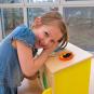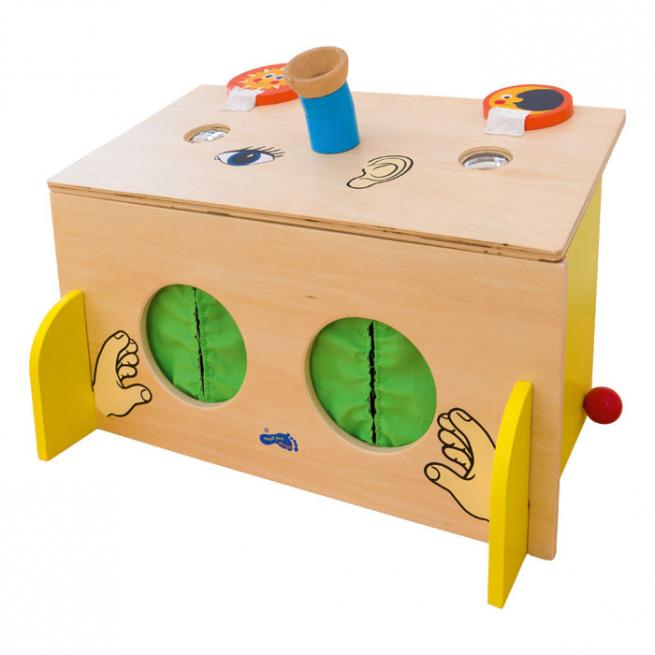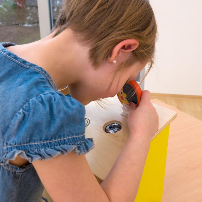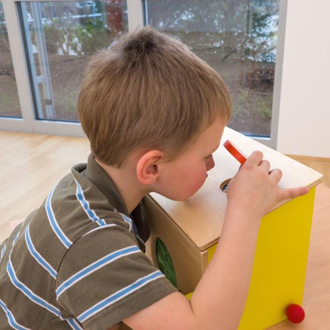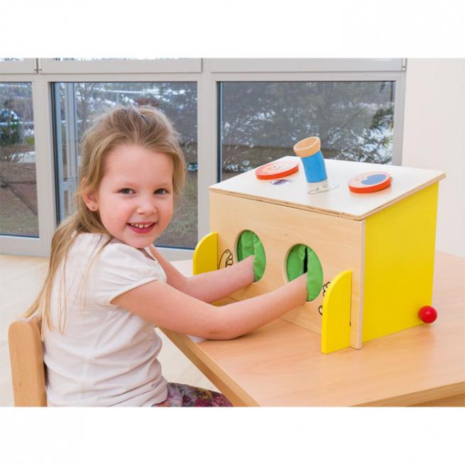 Sie befüllen sie mit immer anderen, Gegenständen. Um herauszufinden, was denn Spannendes in der Box ist, müssen die Kinder entweder hineingreifen und den Gegenstand ertasten, durch die beiden Prismalinsen hineinsehen oder ihr Ohr an den Trichter legen und horchen.