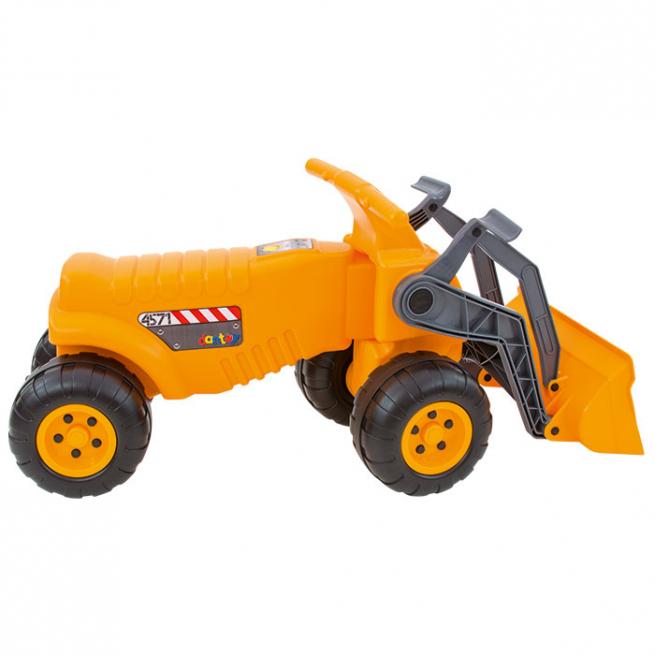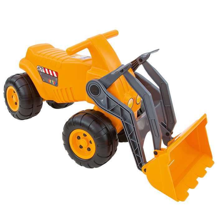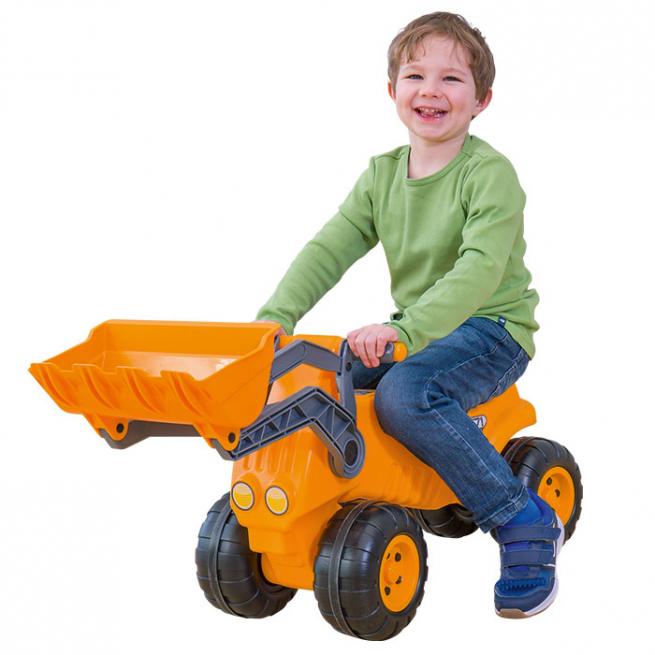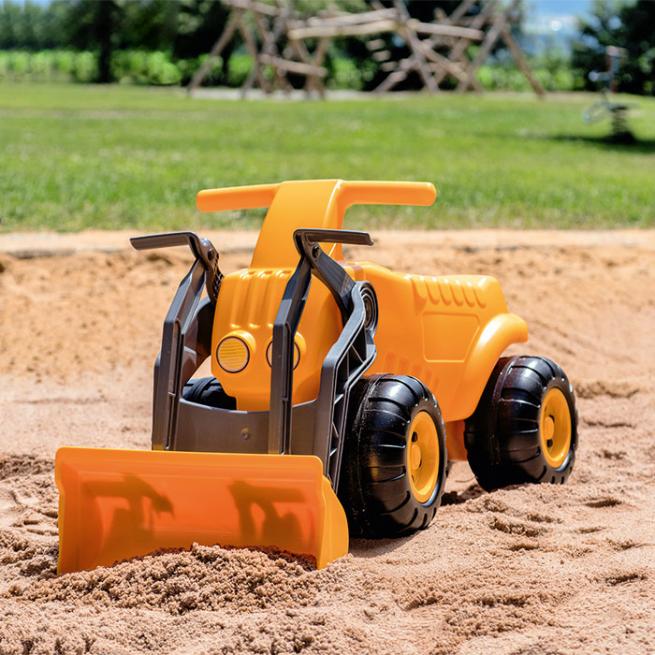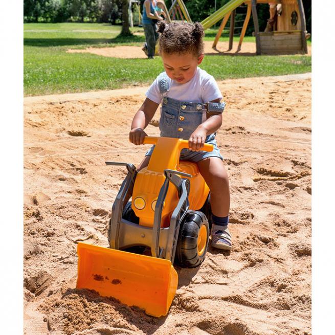 Selber auf dem Radlader sitzen und Sand baggern wie richtige Bauarbeiter, das macht Spaß! Variable Bedienfunktionen beleben das Spiel und fördern die Koordinationsfähigkeit. Besonders stabil – für den Kindergarten-Alltag gemacht. Ohne Bremse.