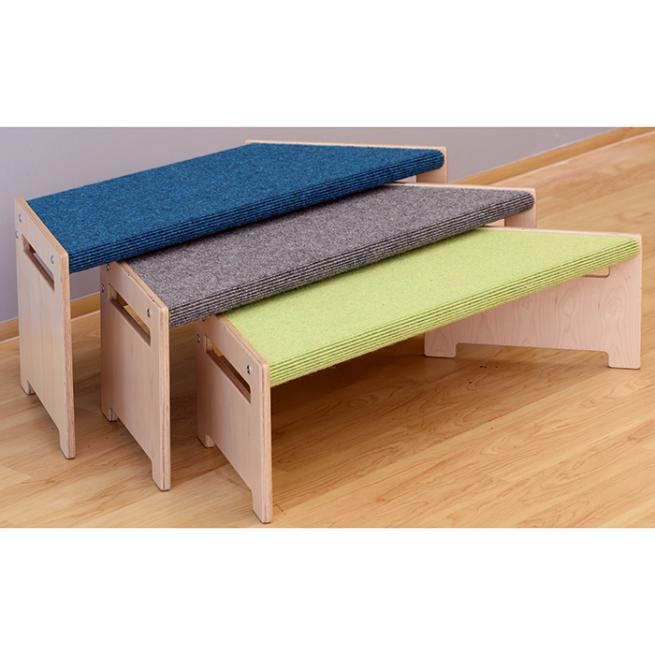 Hochwertiger Tretford-Teppich macht die Sitzfläche der Bank in Trapezform angenehm und strapazierfähig. Erhältlich in drei verschiedenen Farben und Sitzhöhen. Dank Grifflöchern leicht umzustellen. Zur einfachen Selbstmontage.
