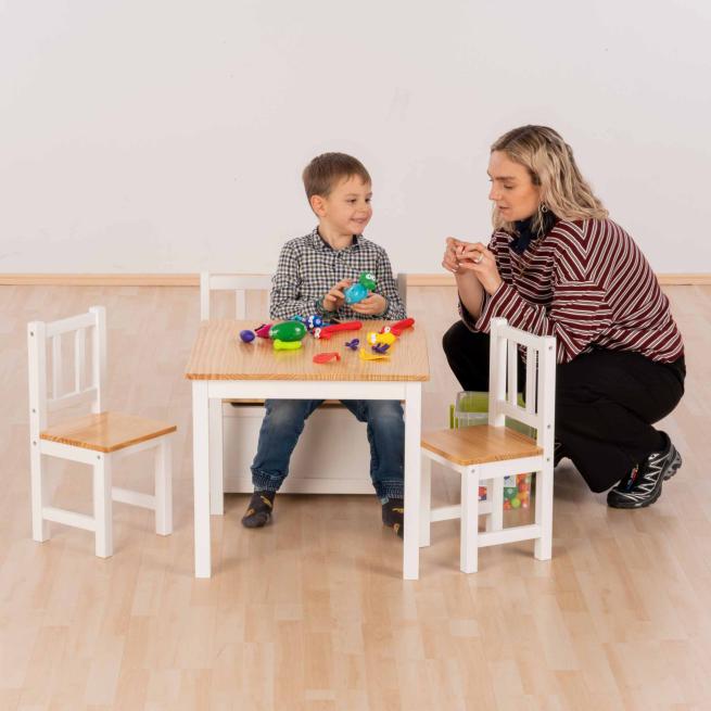 Die Kindersitzgruppe Fenna bringt Kinder ganz selbstverständlich zusammen. Hier setzen sie sich an einen Tisch, greifen zu Stiften und Papier, teilen ihr Frühstück oder versinken gemeinsam in Gesprächen. Zwei Stühle und ein Tisch bilden eine vertraute kleine Insel im Raum, die Kindern Sicherheit gibt und zum Verweilen einlädt. Die helle Kombination aus Weiß und Naturholz wirkt ruhig und freundlich und fügt sich harmonisch in Gruppenräume, Spielecken oder den Essbereich ein.