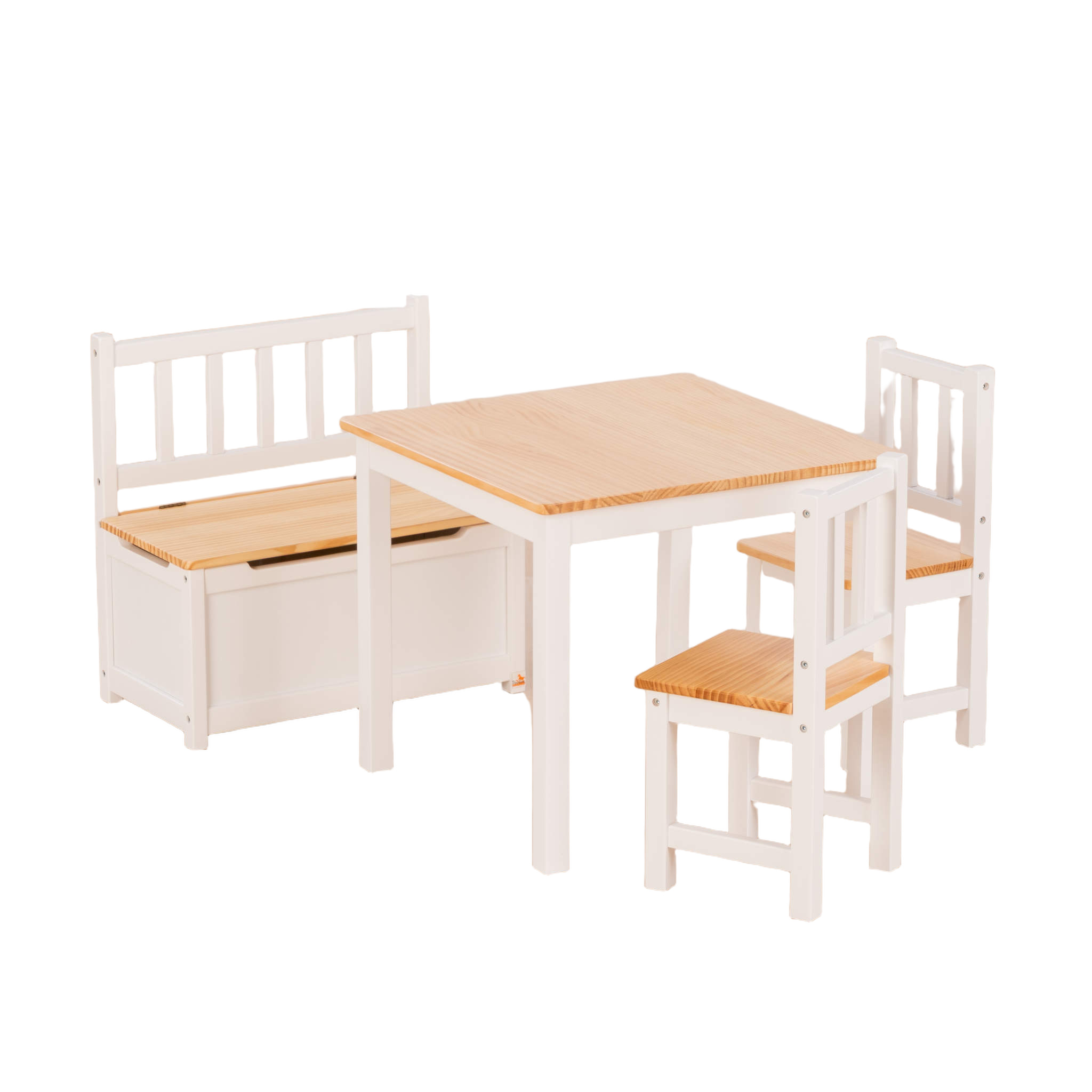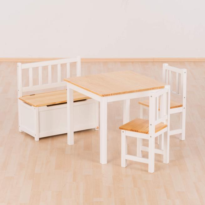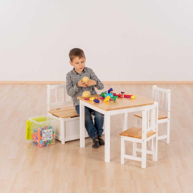 Kinder fühlen sich hier sofort wohl und nehmen gern Platz. Dank der kindgerechten Sitzhöhe sitzen die Kinder bequem und konzentriert, egal ob sie malen, basteln, puzzeln oder bauen. Die massive Kiefer sorgt für Stabilität und vermittelt ein wertiges Gefühl, das auch im turbulenten Alltag bestehen bleibt. Die Kindersitzgruppe Fenna begleitet Kinder durch viele Spielideen, kleine Rituale und gemeinsame Momente. Sie wird zum festen Treffpunkt, an dem Freundschaften wachsen und Alltagssituationen spielerisch stattfinden.Praktisch: die Truhenbank