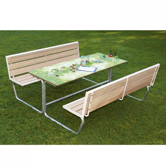 Die Tischplatte ist eine robuste Massivplatte mit hochwertigem Druck in Grüntönen. Die Sitzfläche besteht stabilem Aluminiumrahmen (in Weiß) mit Holzeinsatz aus hellem Bambus. Die Lieferung erfolgt teilzerlegt zur einfachen Selbstmontage.