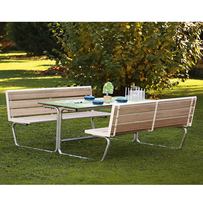 Die Sitzbank mit Holzeinsatz ist wahlweise mit Rückenlehne oder ohne Rückenlehne erhältlich.