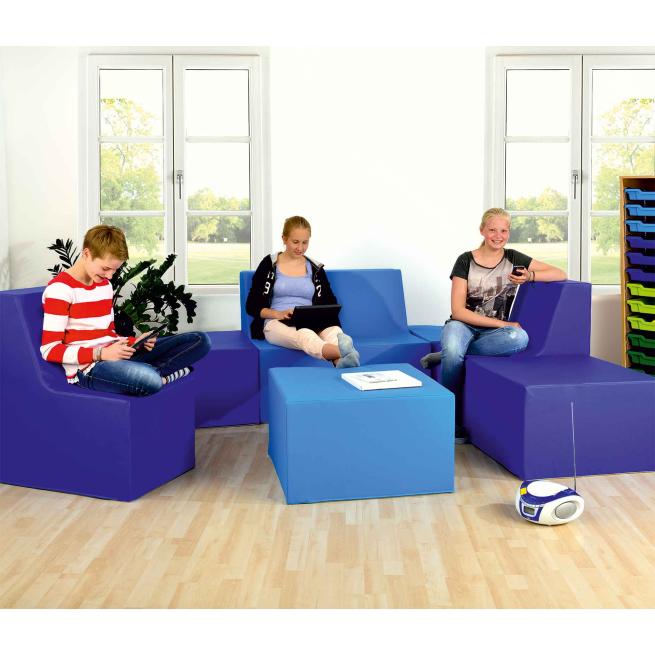 Flexibel und schnell wieder umgestellt. Je nach Situation passend. Ob Gesprächsrunde, Spielrunde oder zum Entspannen. Die Schüler richten sich diese Sitzelemente-Kombination immer wieder selbst ein.