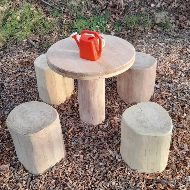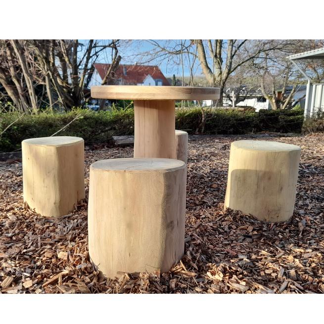 Rustikale Runde. Am Tisch und den vier Pollern nehmen bis zu vier Kinder Platz. Der runde Tisch und die vier Sitzpoller sind wetterfest, langlebig und bleiben auch bei direkter Sonneneinstrahlung angenehm temperiert. Ideal für den dauerhaften Einsatz auf Schulhöfen oder Spielplätzen. Die hochwertige Robinie ist besonders widerstandsfähig und eignet sich hervorragend für den Einbau in Rasen oder sandige Böden mit Hackschnitzel-Abdeckung. Tisch und Poller sind auch jeweils einzeln erhältlich. Die Lieferung erfolgt auf Palette.