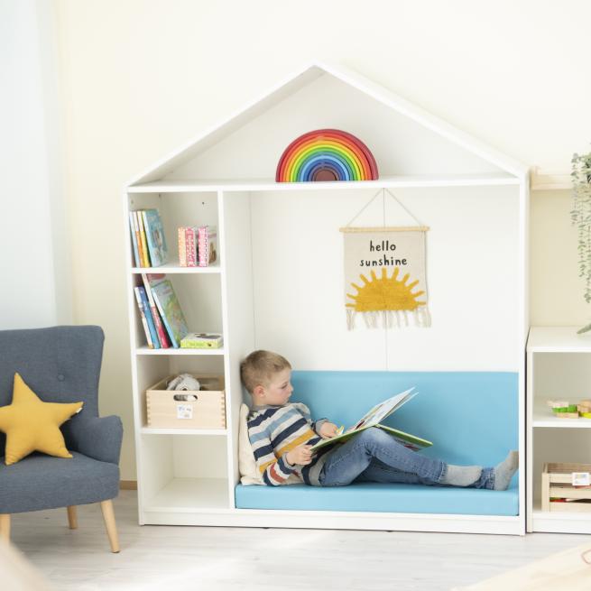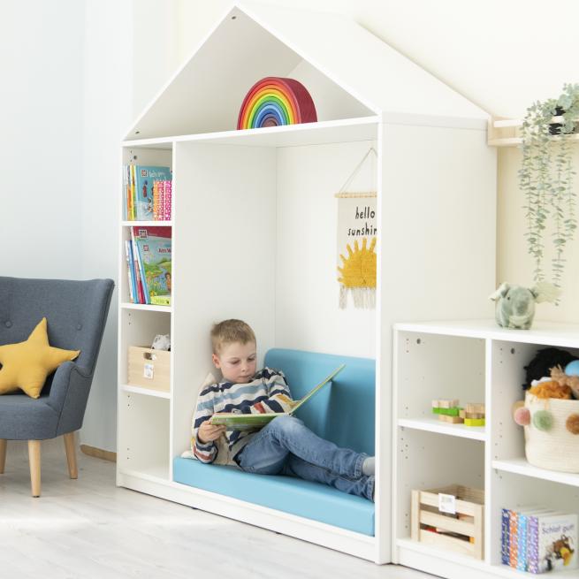 Tipp: Lust auf eine ganze Leselandschaft? Alle Elemente der Serie Feria sind optimal kombinierbar. Entdecken Sie das Haus Seifenblase, das passende Sitzpolster, die Feria Regale, die Feria Schubladen, die Feria Regaltüren und das Regal Haus.
