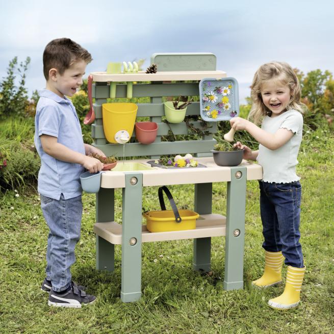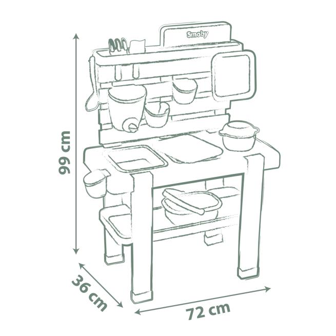 Kräftig matschen, mischen, kneten: Mit der Smoby-Matschküche entdecken Kinder die verschiedensten Naturmaterialien – und das mit viel Spaß und Experimentierfreude. Dabei darf selbstverständlich auch mal was danebengehen. Denn der Recycling-Kunststoff, aus dem die Matschküche besteht, ist robust, äußerst leicht zu reinigen und perfekt geeignet für den Outdoor-Einsatz.